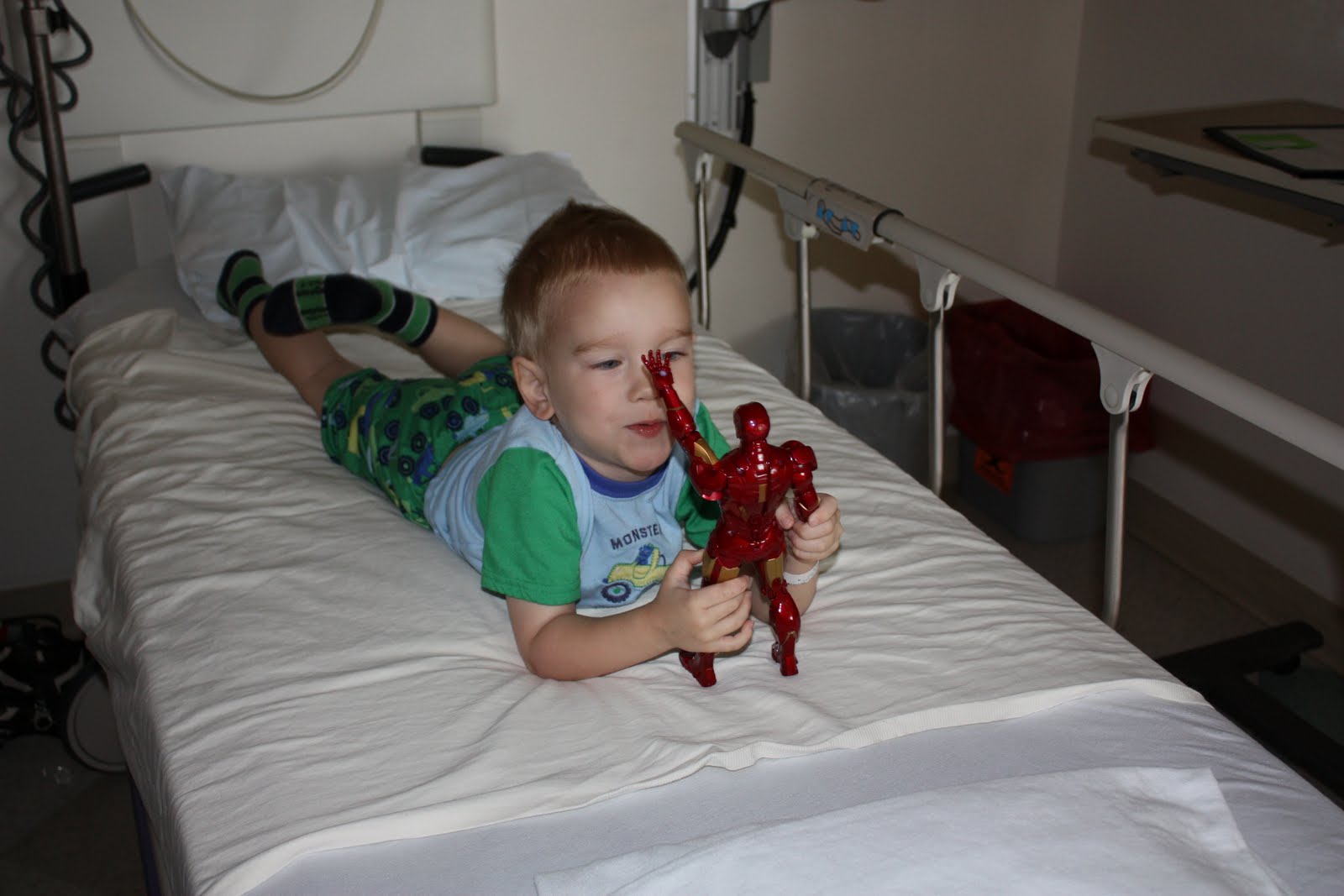 Garrett had his surgery today. What a day!!! Last night before church we took Garrett to Toys R Us and let him pick out a special toy....of course he chose Iron Man!!! Then after church we took him to his FAVORITE resturant......Red Robin where he ate a cheese burger, french fries, and a chocolate sundae.